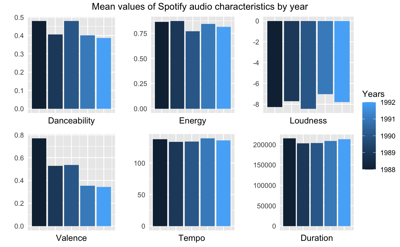 annotate_figure(plot, top = text_grob("Mean values of Spotify audio characteristics by year"))Below you can see the corresponding illustration.
