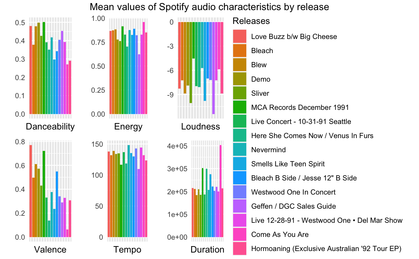 annotate_figure(plot, top = text_grob("Mean values of Spotify audio characteristics by release"))The illustration below is the output of the last code chunk.