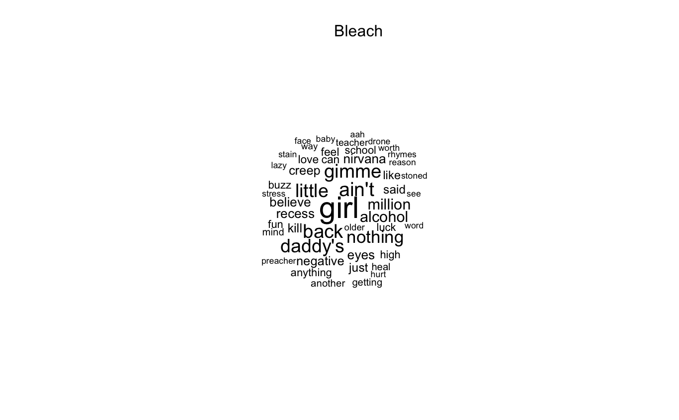 dbDisconnect(db)The code above creates a wordcloud for each release, but since some of the releases in this case are live albums and demos, some patters are repeating. For this reason, I am going to show wordclouds for only some of the albums, which will be shown below.